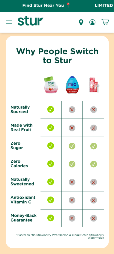 Adding a competitor comparison block to the homepage helped Stur position their unique value proposition above their top comepetitors. Purchase rate increased 22% with 95% confidence and revenue per visitor increased 39% with 99% confidence.
